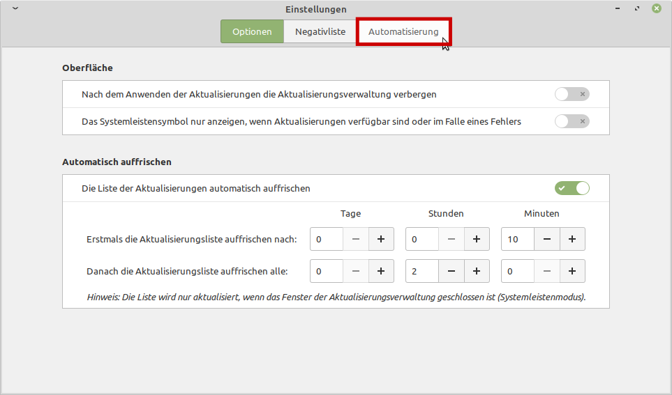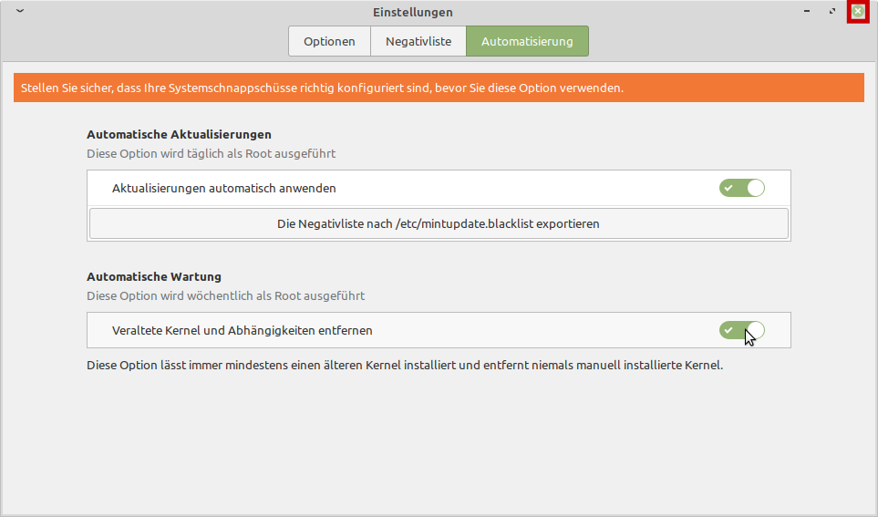 Genau wie man es auch von anderen Betriebssystemen gewohnt ist, können automatische Updates natürlich auch einmal eine unvorhergesehene Änderung bringen und damit schlimmstenfalls zu Ausfällen führen. Deshalb ist die Automatisierung immer mit Bedacht anzuwenden. Bei Computern, deren Einsatz nicht unterbrochen werden darf, kann eine Sicherung des Systems, d.h. ein regelmäßiges Backup, z.B. mit „Timeshift“ angelegt werden.